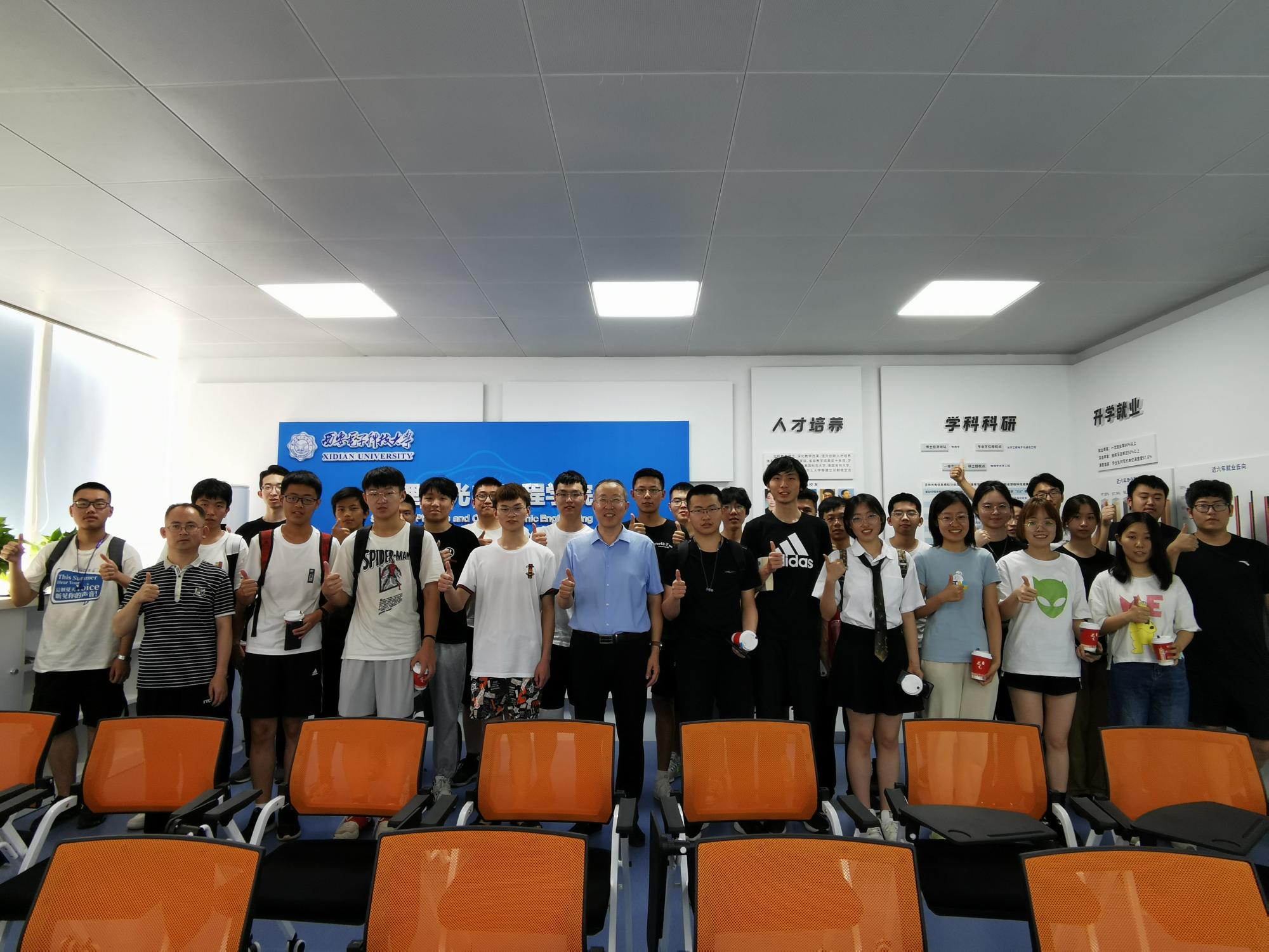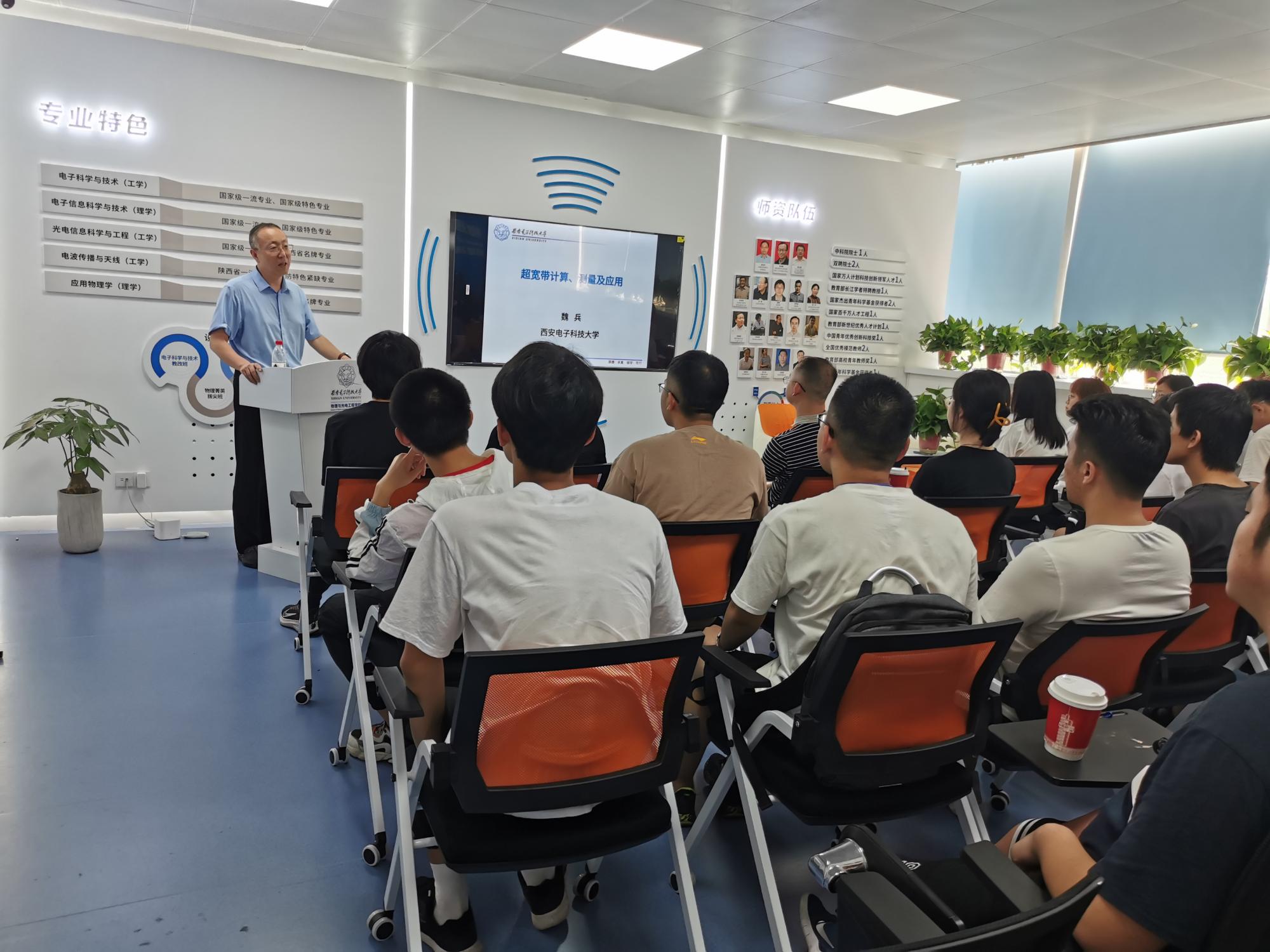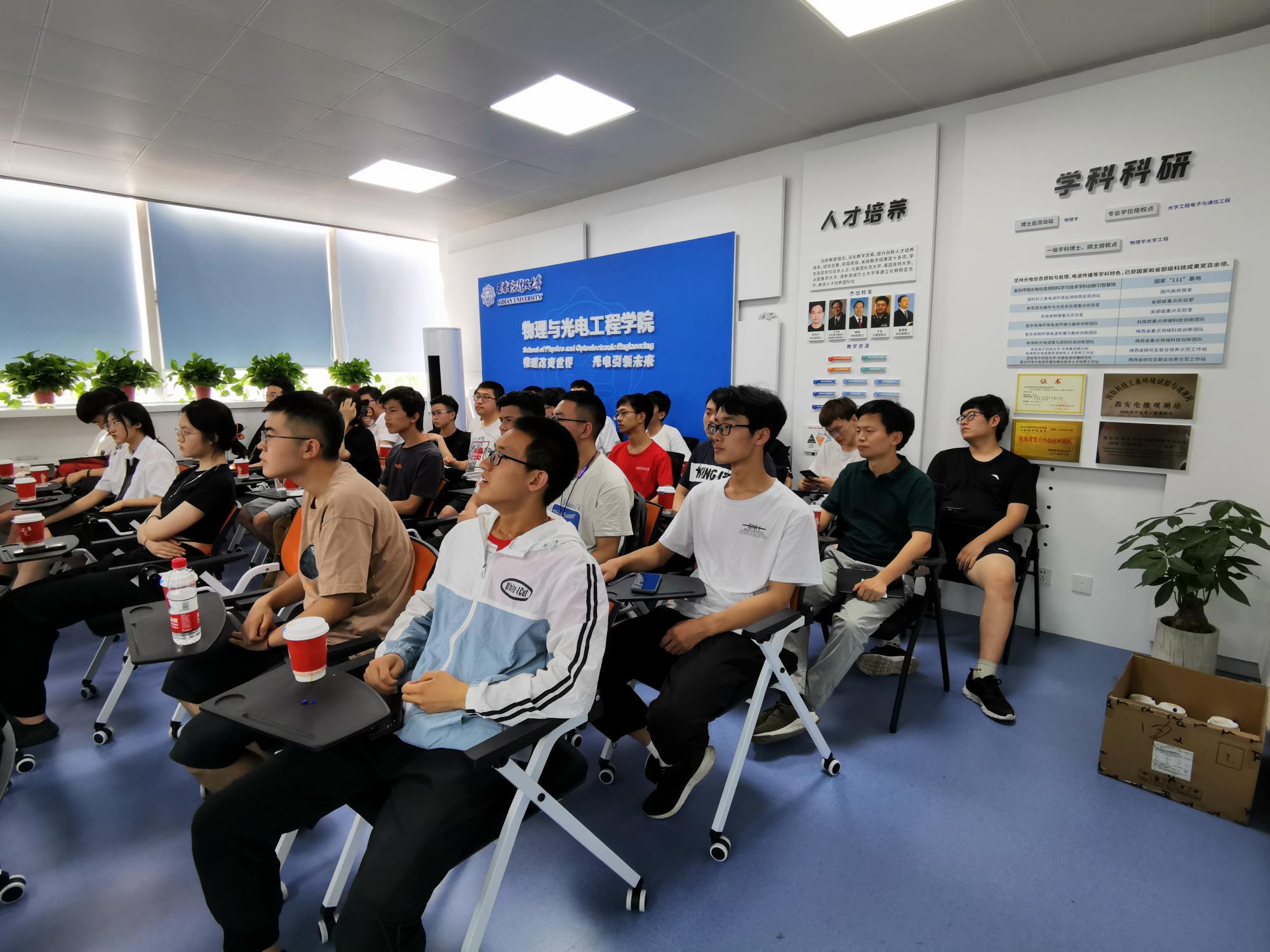 魏兵教授着重为同学们介绍了物光院的发展历史沿革、理工融合的专业特色、团队队伍和升学就业概况。他耐心细致地为同学们介绍了物光院面向电子信息大类本科生开设的三个国家一流专业(电子科学与技术、电子信息科学与技术、光电信息科学与工程)和国防紧缺专业(电波传播与天线)各自的特色。在梳理和回顾公司在人才培养方面已取得的硕果时,魏教授反复强调发展基础学科、学好数理基础的重要性。
