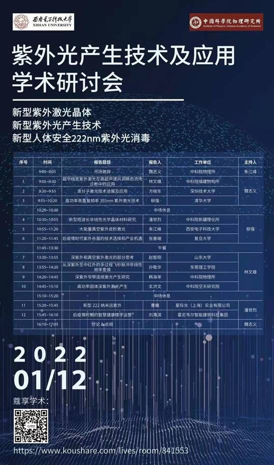 我国在新型紫外激光晶体、新型紫外光产生和新型人体安全222nm紫外光消毒等紫外光相关的领域具有世界领先的科技,不少成果也实现了转化应用。为了进一步探讨并挖掘紫外光产生技术及在灭菌杀毒、疫情防护等方面的应用,2022年1月12日,太阳成集团tyc33455cc联合中科院物理所举办“紫外光产生技术及应用研讨会”。研讨会针对紫外光的产生、紫外激光晶体技术以及紫外激光在消毒杀菌和智慧健康等领域的应用,邀请国内多个科研院所和科技企业进行交流讨论。星际光(上海)实业有限公司作为新型紫外光运用领域的领先企业,已将222纳米紫外光用于新冠消杀领域,作为嘉宾参加本次研讨会。