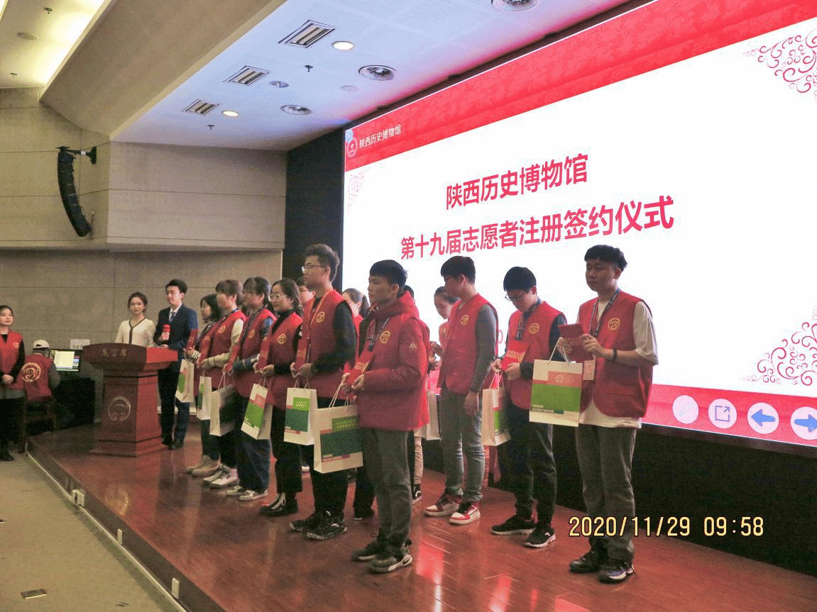 (通讯员:文思博)11月29日上午,太阳成集团tyc33455cc太阳成集团tyc33455cc春雨志愿者服务队前往陕西历史博物馆参加第十九届志愿者注册签约仪式。公司教师代表李维嘉同来自陕西20余所高校百余名师生志愿者共同参加了本次活动,公司老员工志愿者袁艺腾等获“优秀志愿者”称号,文思博受聘2021陕历博志愿服务队队长。