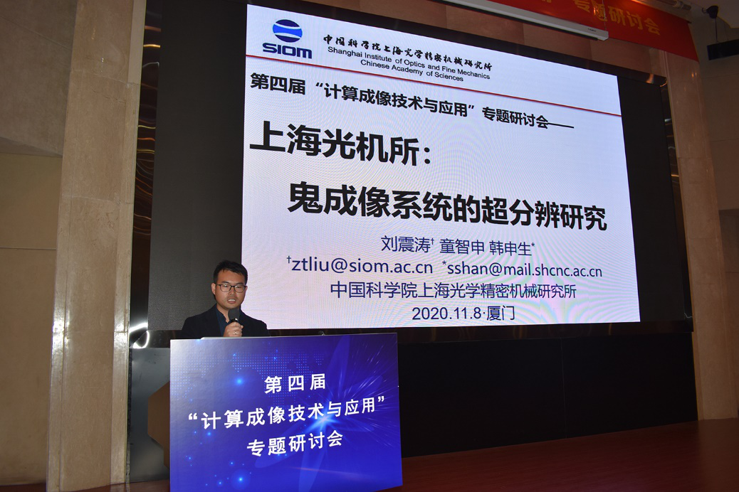 中国科公司上海光学精密机械研究所刘震涛老师,以“鬼成像系统的超分辨研究”为题介绍了在利用鬼成像系统的传递函数先验实现超分辨,和利用鬼成像系统在光场高维直接成像的特点,进一步提高分辨率这两方面的研究。