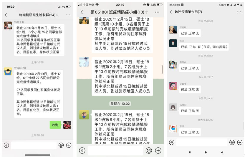 根据研究生现有组织结构,太阳成集团tyc33455cc建立了“公司—班级—班小组”的三级防控管理体系。公司层面由公司防控组主管领导统筹安排,研究生导师、研究生辅导员、研究生兼职辅导员具体实施,要求各负责人及时汇总分析疫情数据、向上反馈防控信息、处理各项突发事件。班级层面由支委、班委成员组成班级防控工作组,全面掌握班级各人情况,汇总各工作小组每日上报信息,排查、关注并跟踪“身处疫区、身体异恙、数据异常”情况。班内根据实际情况,以同宿舍、同实验室、同地区等方式灵活划分防控工作小组,每组设组长一名,保证各项通知落实、各类数据如实、各人填报及时,实现研究生疫情防控工作“人盯人”要求。