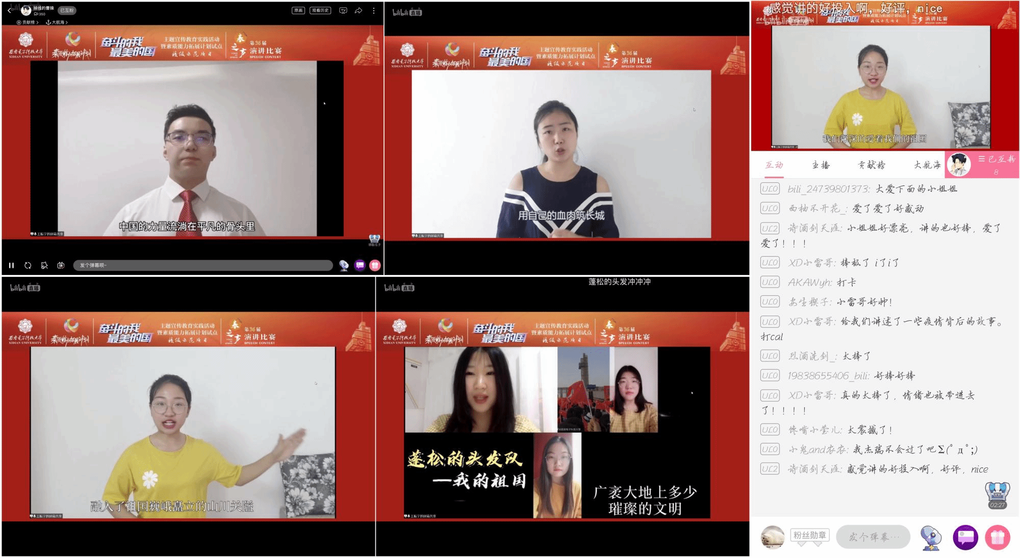比赛现场激昂热烈,“精神小伙solo”队着眼新时代背景,发出了“以青春之名,奋进新时代”的呐喊;“非你不可”队从“国民女神”李兰娟院士的无畏奉献精神切入,发起了“战疫路上,让我们一起负重前行”的号召;“三个小太阳”队讲述了抗“疫”路上“平凡人”的“平凡事”,谈到“再平凡的骨头里也有江河”;“蓬松的头发”队诗颂《我的祖国》,表达了西电青年对祖国的深情热爱;“RIO”队从国家繁荣与民族团结两个方面,分享了自己对爱国主义思想的理解与感悟;“但行前路”队聚焦抗“疫”中的“90”后力量,展现了新时代青年的使命与担当。
