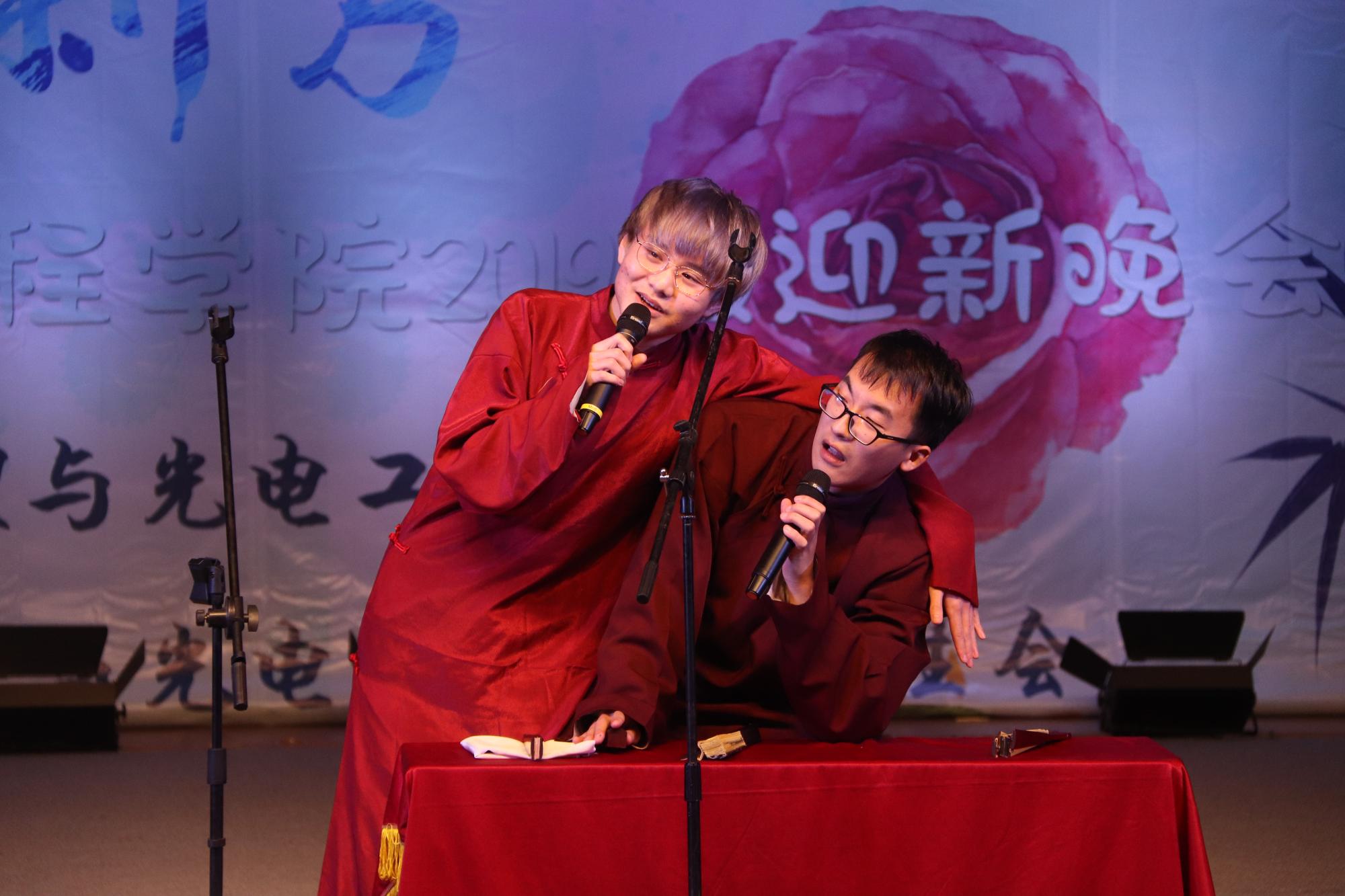 紧接着,郑浩楠同学一首《光年之外》将观众们带入晚会的欢乐气氛;员工会文艺部为同学们带来了原创光影剧《光影少年》,用肢体与光影的绝妙配合展现了新学期专属于新生的西电记忆:从独自踏上火车的紧张、告别时的泪水、初到校园的激动以及认识新朋友的欣喜等;口琴和手风琴合奏的《未闻花名》轻柔舒缓,令人沉醉;辅导员王晨辉、韩金虎现场抽取了幸运观众并为新生送上了祝福,希望同学们在美丽的太阳成集团tyc33455cc能够不负韶华、学有所成;抽奖环节过后,晚会继续进行。介四相声社带来的相声《我要招新》令现场观众捧腹大笑,欢笑声不绝于耳;B-force街舞社带来的舞蹈《快乐黑怕》,用明快的节奏带我们领略了协调的美感与团队的力量;新生同学展现了自己的风采,带来的歌曲串烧娓娓动听。在此之后又到了紧张刺激的游戏环节,在场观众自发上台参与游戏《谁是卧底》,大家斗智斗勇、绞尽脑汁,参与互动的同学们均领取到了精致的小礼品。