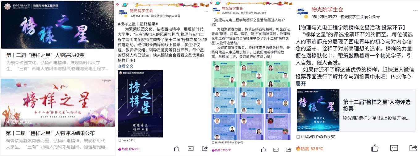 经过宣传报名、资料审核、事迹巡展、网络投票、正选提名等为期三个多月的层层选拔,最终评选出:以身“格物”、以心“致知”,求学不止,积极求索,潜心科研的“格物致知之星”研究生吴梦瑶、本科生袁欣瑶;以德塑人、以学识育人,助力西电学子成长成才的“德育英才之星”魏兵教授;具有奉献意识、强责任心,积极投身校院和社会志愿服务工作的“服务奉献之星”石一诺;善于组织策划或积极参加各类文体活动,挥洒汗水书写青春风采的“萃英芳华之星”伍煜杰;刻苦学习,积极进取,坚持创新追求卓越、实践出真知的“创新实践之星”雷婧,以及在各方面表现突出的众多优秀本科生、研究生和专任教师。