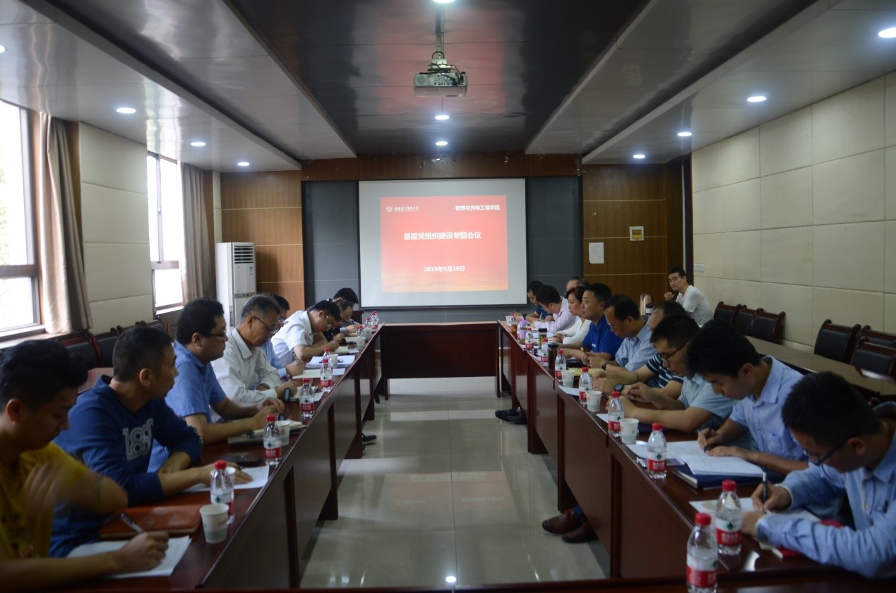 (通讯员 王晋)2019年9月30日,物理与光电工程公司党委理论中心组(扩大)会议在北校区西大楼召开。副董事长高新波巡听会议,并就“不忘初心、牢记使命”主题教育和基层党建工作情况进行调研指导。公司领导班子及教职工党支部书记、系(所、中心)和机关办公室负责人、员工党支部书记和辅导员代表等参加了会议。会议由党委书记独国社主持。