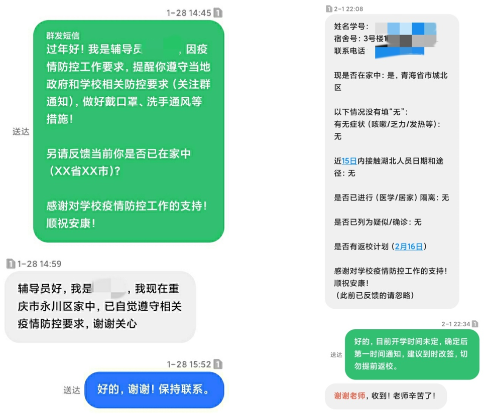公司领导亲自指挥,辅导员带领班干部、员工党员及联络员构建信息反馈通道,与班级员工逐一联系对接,及时准确了解员工身体情况和思想动态,实现“疫情通”等信息填报快速高效全覆盖。公司还发布心理健康视频帮助调整员工心理状态,及时疏导员工出现的紧张、焦虑、猜疑、恐慌等心理情况。问卷收集员工在家进行线上学习的困难需求,为建档立卡的湖北籍家庭困难员工争取临时性困难补助,在明确疫情防控工作安排和要求的同时,关心解决好员工的实际困难。目前,公司本科生及研究生身体状况良好。