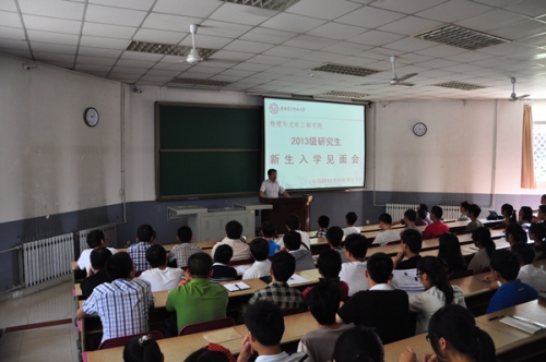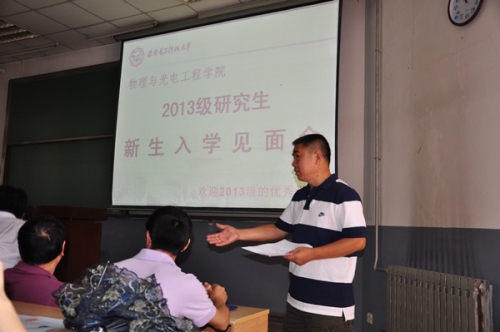 公司筹备领导小组组长郭立新就公司的发展历史、学科设置、科研方向、研究成果向各位新生做了介绍,之后就学习方法、学习态度、团队合作等方面对在场的各位新生提出了几点建议和希望,希望他们在物理与光电公司能学有所成。
