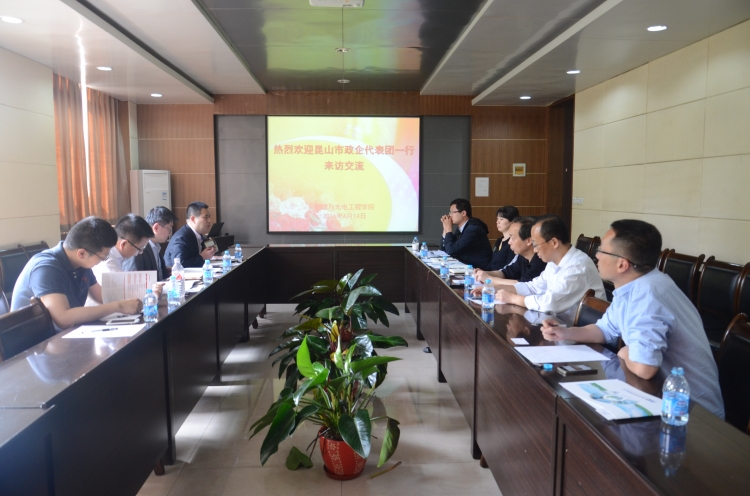 (通讯员王苗)4月14日下午,昆山市经济技术开发区管委会主任助理王晓荣、昆山市巴城镇党委副书记云霄、昆山康佳电子有限公司总经理助理王锦标、昆山龙腾光电有限公司经理洪进宏一行来公司调研,副经理邵晓鹏、激光技术系主任朱江峰及公司相关教师在北校区会见了来访嘉宾,就“产学研”合作事宜进行交流座谈。