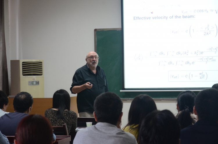 报告中,Gousebet教授首先介绍了电磁学领域的基本理论,并提出广义米理论(GLMT)能够用于处理任意波形的光束与粒子间互相作用,同时介绍了他们在有形波束光传输方面的最新研究成果,基于平面波角谱分解,分析了不同波束的的光传输特性。随后Gousebet教授演示了飞秒脉冲激光与粒子的相互作用的仿真结果,研究分析了光传输的非线性效应。