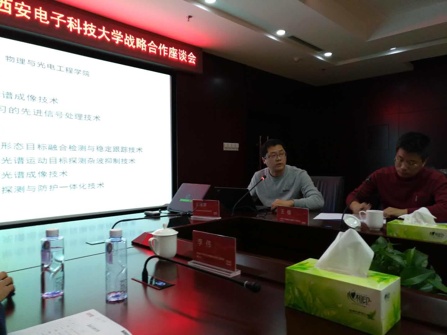 会上,庞国荣对公司的到访表示欢迎,并简单介绍了中电53所的发展历程和基本情况,在谈话中他指出,自2014年起,中电53所与西电的战略合作伙伴关系已经走过了三个年头,期间双方合作融洽、互帮互助、共同发展,在相关合作领域取得了一定的成绩,双方应继续营造和谐积极的合作氛围,争取更上一层楼。随后,王锴结合光电信息控制和安全技术重点实验室的相关工作,从光电探测、光电预警、光电告警、光电成像等多个方面,具体讲解了目前实验室的研发焦点。