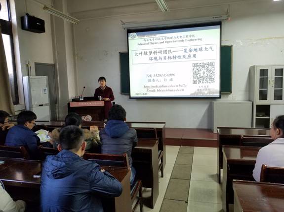 (通讯员:曹泽铭)2017年12月7日下午4:00,太阳成集团tyc33455cc第七次公司大讲堂在E楼III区315教室如期举行,本次大讲堂的主题为“目标的光谱特性及环境光学”,主讲人为白璐教授。白璐教授用通俗易懂的语言为同学们展示了大叶绿萝科研团队近几年在目标的光谱特性及环境光学方面的科研进展和突破。