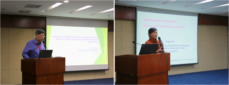 开幕式结束后,来自美国马里兰大学的基地海外学术大师Chein-I Chang教授率先为各位师生做了题为“Hyperspectral Magnetic Resonance Imaging”的学术报告,报告主要就高光谱在磁共振成像方面的理论研究和工程应用做了详细的讲解。随后,Yen-Chieh Ouyang教授,Xiuping Jia高级讲师和Ajmal Mian副教授分别做了题为“Hyperspectral Magnetic Resonance Imaging Application: Measure of Breast Mass Using Intra-Voxel Incoherent Motion (IVIM)”,“Hyperspectral Image Interpretation: Hard or Soft Classification with SVM”和“Machine Learning for Hyperspectral Image and Human Action Analysis”的报告,分别阐述了关于高光谱磁共振成像应用、高光谱遥感图像分类方法、基于机器学习的高光谱成像和人类行为分析的研究成果。