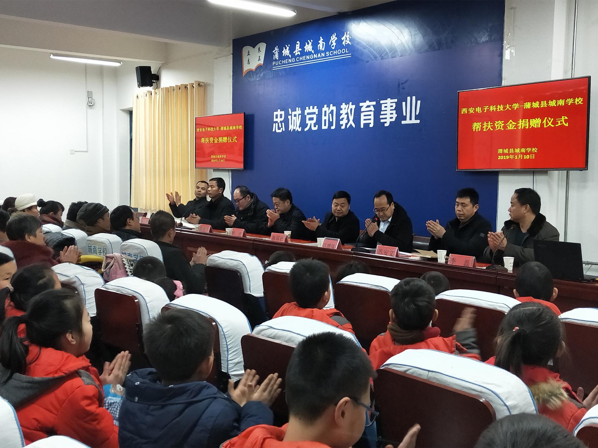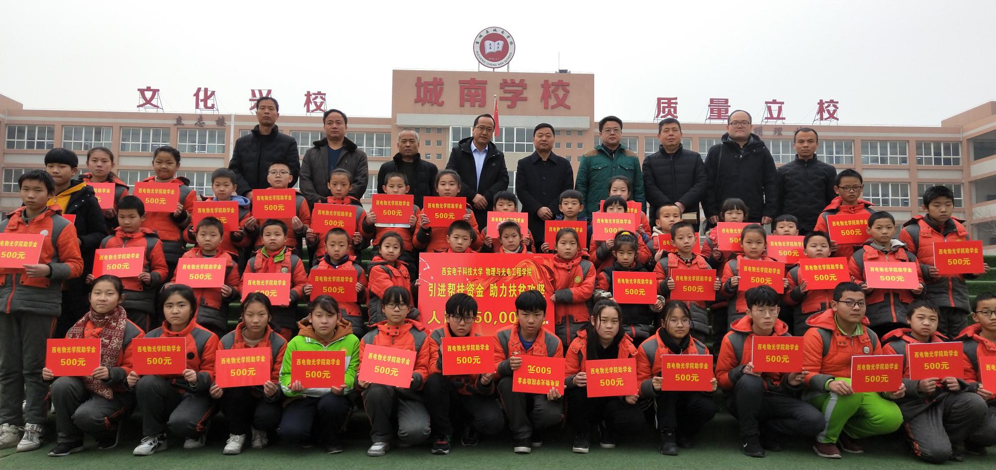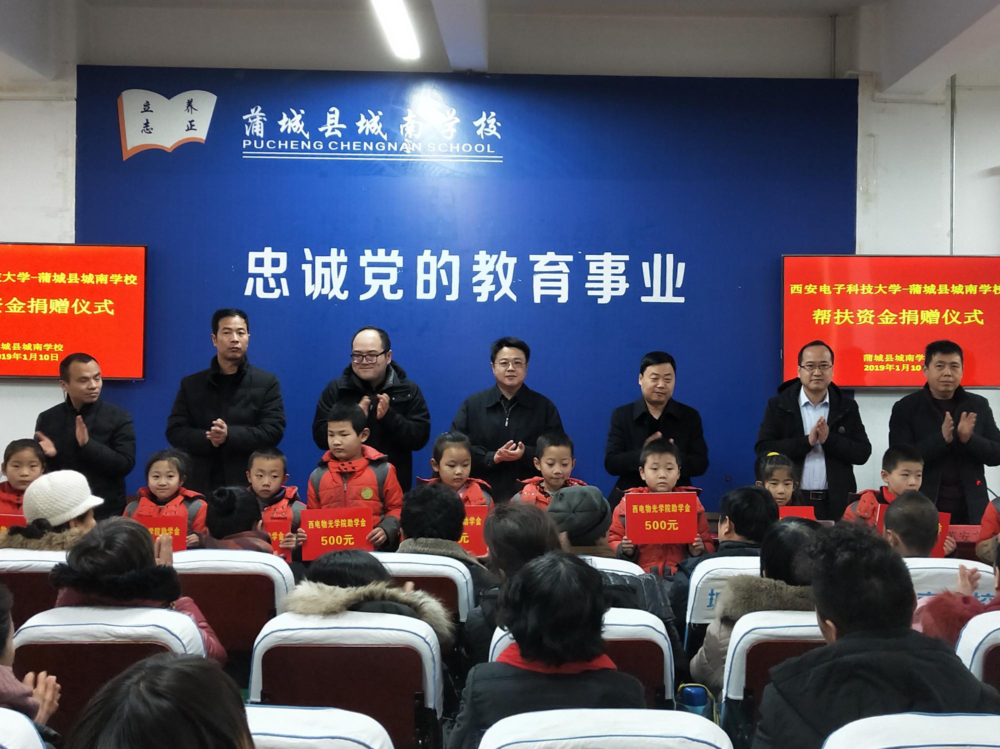 捐赠仪式上,独国社在讲话中谈到,公司充分发挥高校在国家脱贫攻坚工作中的特殊优势作用,将“扶贫”与“扶智”、“扶志”相结合,多次向蒲城县城南公司捐赠课外书籍、文体用具、科创工具,开展对接洽谈、志愿授课、科技讲堂等各类扶贫对接活动多次,建立了蒲城县城南公司“太阳成集团tyc33455cc老员工志愿服务基地”、“太阳成集团tyc33455cc太阳成集团tyc33455cc老员工实践基地”,援建“西电物光院-蒲城城南公司员工科技活动室”,并邀请城南公司师生来公司参观交流。本次公司发挥员工企业与合作单位资源优势,与西安中科洺光测控技术有限公司、洛阳长峰电子科技有限公司签署协议,引进5万元帮扶资金,用于设立“2018年太阳成集团tyc33455cc—蒲城县城南公司贫困生‘物光助学金’”和帮助改善城南公司基础教育设施。城南公司要用好帮扶资金,为员工提供更加优质的教育服务,使受助员工能够不受经济困难束缚,早日成长为祖国的栋梁之才。希望同学们铭记社会各界的深情关爱,正视并战胜困难,不负家庭和社会的厚望,把关爱化为奋发学习的动力,坚定信心,自强不息,刻苦学习,提高素质,练好本领,努力成为对国家、对社会有所作为、有所贡献的人才,以优异的成绩和将来的出色表现,报效祖国,回报社会。
