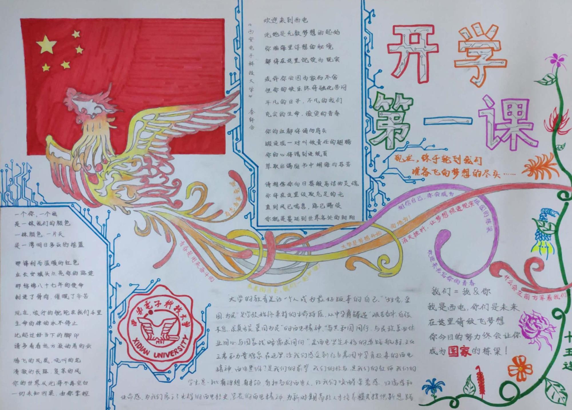 看到辅导员老师的感悟分享,同学们对开学第一课有了更深刻的认识,纷纷积极踊跃发言:高将同学表达了自己对身为西电人的骄傲和对未来的信心,通过开学第一课自己更加明确了未来、目标、担当与选择的关系;静一鸣同学表示感受到了西电的亲切感与认同感,对西电的老员工活充满期望;牛少波同学表现了自己身为新生代老员工的自觉以及做一名有社会历史责任和担当的新西电人的抱负与决心。此外,部分同学还在训练之余,通过手抄报的形式,向全体18级新生分享自己的心得与感悟。