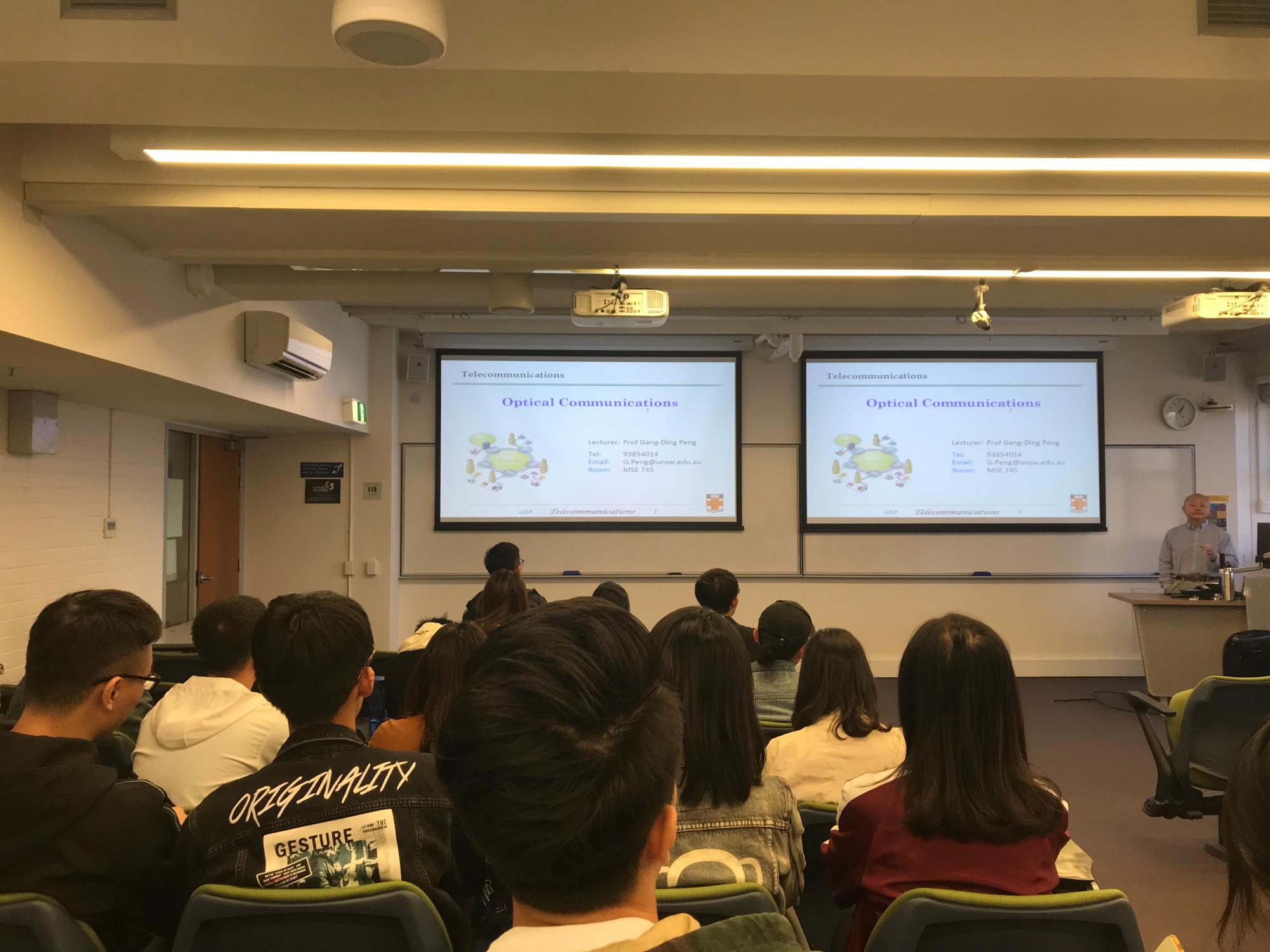 电子信息类专业课程由新南威尔士大学光电子研究中心主任,美国光学学会会士、国际光学工程学会会士的Gang-ding Peng教授主讲。Peng教授授课方式非常独特,讲授内容深入浅出,常常先抛出一个问题再逐步引导员工们去思考,在员工思考的同时会用简洁明了的陈述帮助员工加深理解。彭教授还邀请同学们参观了光电子研究中心的各类实验室,了解了新一代光纤的研发过程,引起了同学们极大的兴趣。