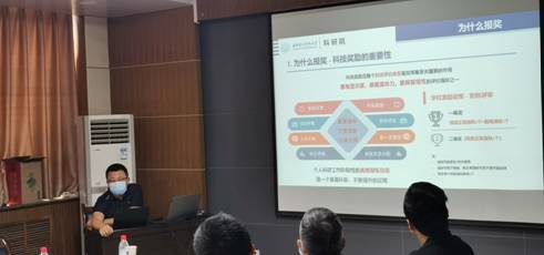 张毅就科研院关于科研报奖的工作进行了说明,他表示科研院全方位支持教师申报各级、各类科研奖项,并且对于报奖过程中遇到的问题,科研院可随时为大家提供帮助。李鹏从为什么报奖、有什么奖项和怎么报奖三个问题为主线向参会教师介绍了科研报奖的相关内容,针对自然科学奖、技术发明奖和科学技术进步奖等奖项的异同;报奖材料的撰写;以及报奖的流程进行了细致地分析和说明。同时,根据近年公司国家奖和陕西省奖的获奖情况,李鹏介绍了获奖科研项目的特点。