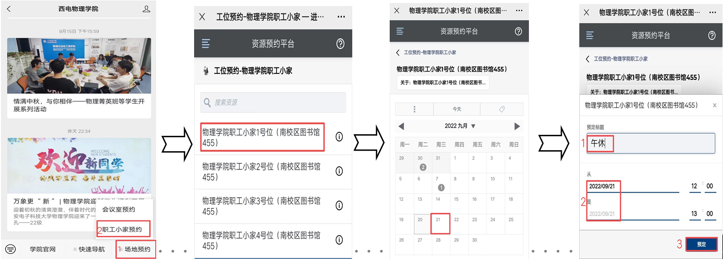 【预约方式】:微信公众号“西电太阳成集团tyc33455cc”-场地预约-职工小家预约-选择工位、日期-预约提交-预约成功(注:每人每天仅限预约1次工位)。