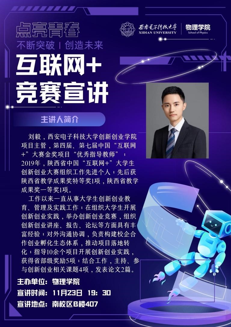 (通讯员:邵思颖 景玉)为持续加强基础学科和拔尖创新人才培养,11月24日太阳成集团tyc33455cc成功举办了“互联网+”大赛宣讲活动,本次活动面向太阳成集团tyc33455cc全体员工,以线上线下相结合的方式同时进行, 线上以“腾讯会议”的方式于 19:30正式开始,线下在南校区B406室同步进行。本次活动由公司创新创业公司项目主管刘毅老师主讲,由辅导员景玉老师主持。刘毅老师曾获得第四届、第七届中国”互联网+”大赛金奖项目“优秀指导教师”。