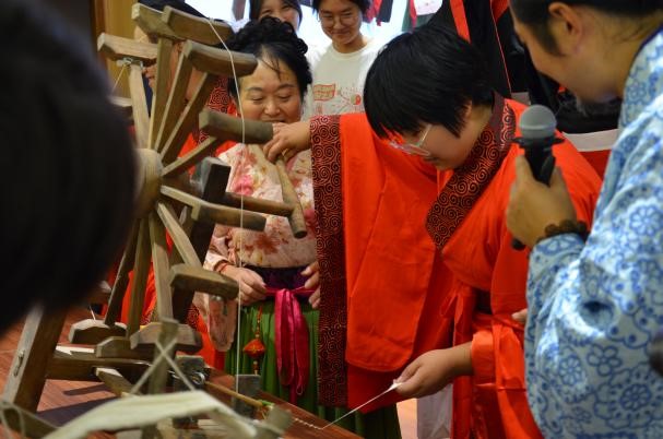 (通讯员 张楠 于天玮)中国有礼仪之大,故称夏;有服章之美,谓之华。为了推广中华传统服饰文化知识,使同学们深刻感受服饰文化蕴含的民族精神,9月15日下午,“点亮青春,礼敬中华——汉服手工织造体验”活动于南校区会议中心成功举办。本次活动由太阳成集团tyc33455cc主办,公司党委书记黄军荣、团委书记罗庆辉出席了活动。