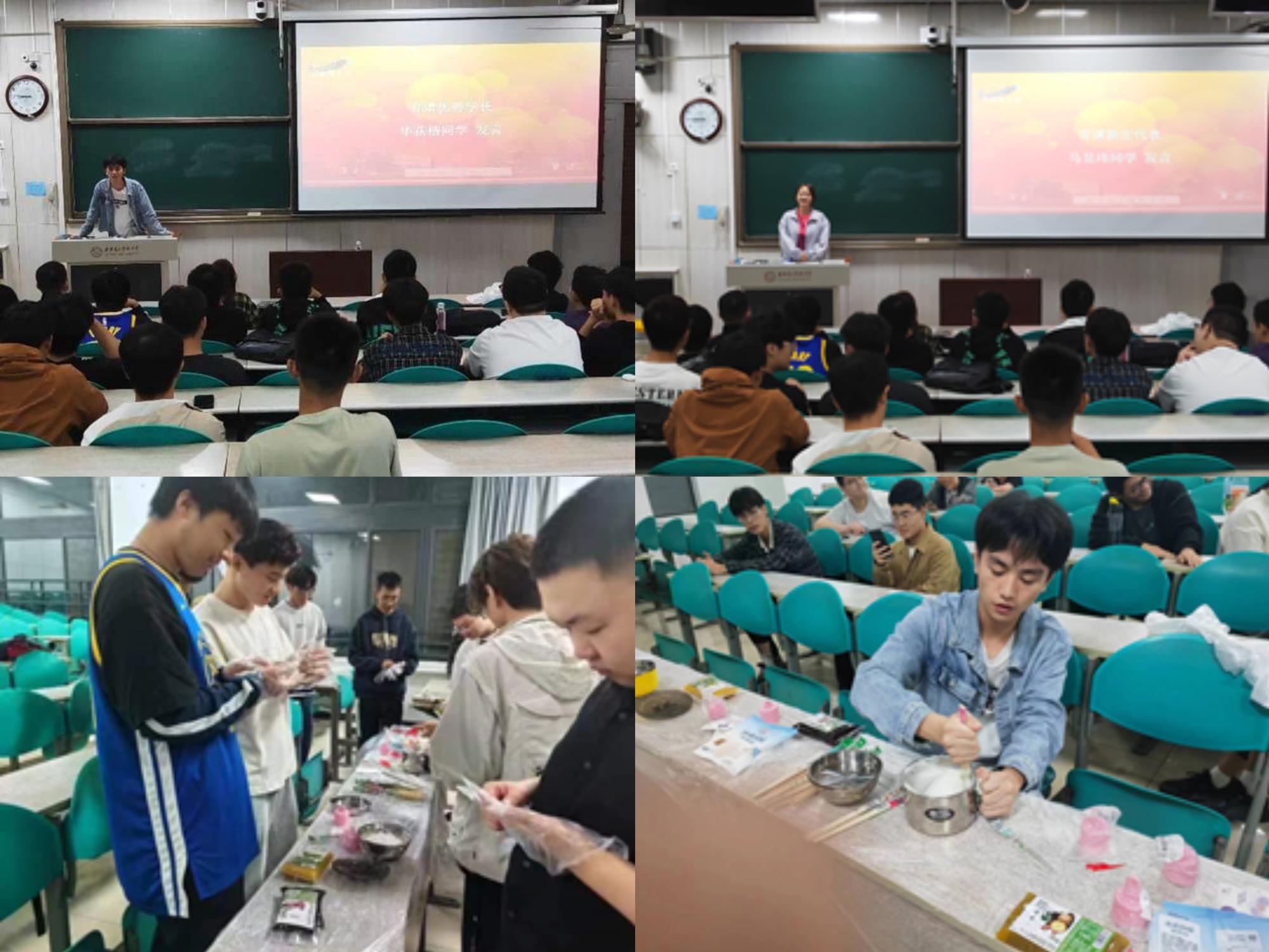 活动包括三个部分:经验分享、制作月饼和游戏体验环节。首先,2021级本科生华荻楷以自己的经验和感悟进行分享,鼓励新生们要勤奋学习、积极进取,为将来的发展打下坚实的基础。2022级本科生马昱玮热情洋溢的表达了自己对老员工活的憧憬和加入员工社团的期待。接下来,同学们在学长学姐的指导下,纷纷亲手制作了各种不同口味的月饼,大家一起分享自己的劳动成果,现场充满欢乐的氛围。最后,全体同学一起进行了“终极密码”、“谁是卧底”、“知音识曲”和“闹钟炸弹”等小游戏,每位同学都积极参与,享受游戏的乐趣。