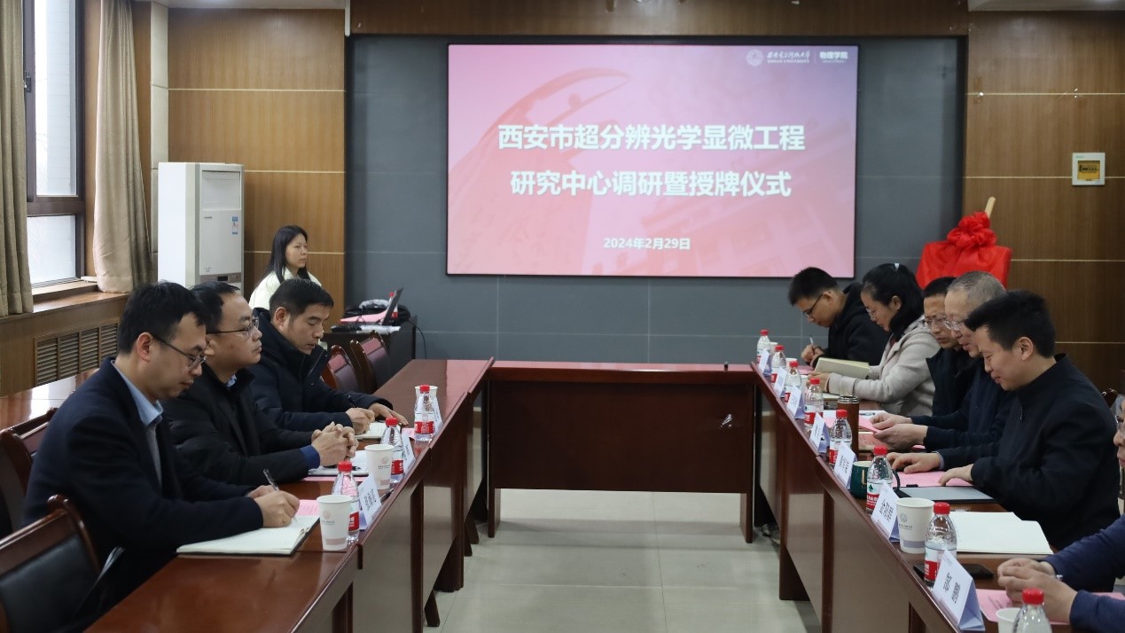 (通讯员:马琳 姚娇)2月29日上午,西安市发改委高技术处处长谢晖一行来校调研西安市超分辨光学显微工程研究中心并授牌。太阳成集团tyc33455cc物理公司党委书记黄军荣、科学研究院能力建设处处长金阳群、工程研究中心骨干教师代表参会,会议由公司副经理魏兵主持。