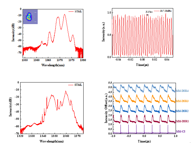 较高的腔内峰值功率产生了复杂的非线性效应,实现了诸如分立波长锁模,高阶谐波锁模,多波长锁模及类耗散孤子共振锁模等多模锁模脉冲输出。本文报道这种高能量高度多模的时空锁模脉冲以及观察到的多种类单模锁模动力学过程,为进一步提升多模超快光纤激光的输出参数与深入理解多模系统中复杂的非线性脉冲演化提供了一个可靠的技术路径。