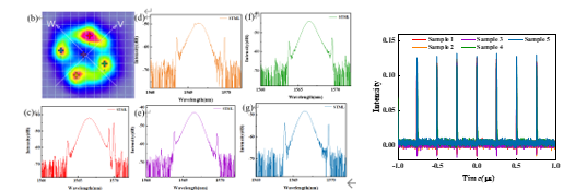 通过对光斑中五个位置进行空间采样并记录输出结果,不同位置具有明显不同的输出光谱(尤其Kelly边带的位置与强度),并且在时域都锁定在同一脉冲序列,证明实现时空锁模。