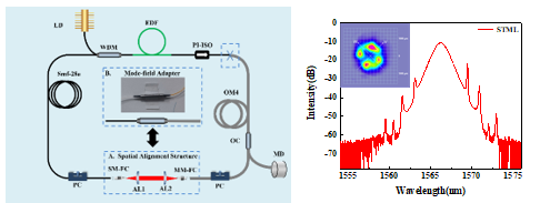 其中,可饱和吸收效应源自空间对准结构耦合效率的功率依赖性,系统中的空间部分结构紧凑并且可以替代为光纤集成模场适配器实现全光纤系统。在800mW泵浦功率下产生的多模传统孤子脉冲具有4.23nJ脉冲能量,明显的Kelly边带及LP21模式主导的输出光斑。