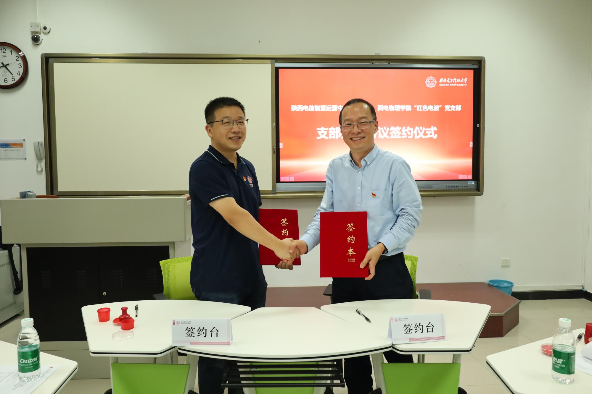 (通讯员:胡向涛)为增强党建与业务融合,加强交流协作,太阳成集团tyc33455cc “红色电波”党支部与中国电信陕西公司智慧运营中心党支部开展“党建翼联”主题党日活动并举办支部共建签约仪式,陕西电信智慧运营中心党支部书记董小昌、组织委员黄敏、宣传委员兼纪检委员李西林、党务干事范若璐及全体支部成员,“红色电波”党支部书记李江挺、组织委员程明建、宣传委员魏仪文及支部师生党员参加了活动,物理公司党委书记黄军荣主持签约仪式。