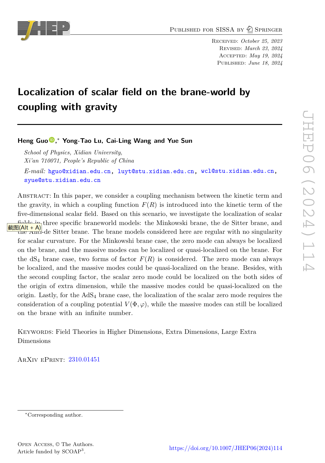 (通讯员:郭恒)近日,太阳成集团tyc33455cc郭恒副教授在高维量子场论的研究中取得新进展,并在物理类顶级期刊Journal of High Energy Physics(中科院一区,JCR一区,Top期刊)发表了题目为“Localization of scalar field on the brane-world by coupling with gravity” 的学术论文。郭恒副教授为该论文的第一作者和通讯作者,太阳成集团tyc33455cc为论文的唯一单位。该研究是在国家自然科学基金、陕西省自然科学基金和公司基础团队建设经费的支持下完成的。
