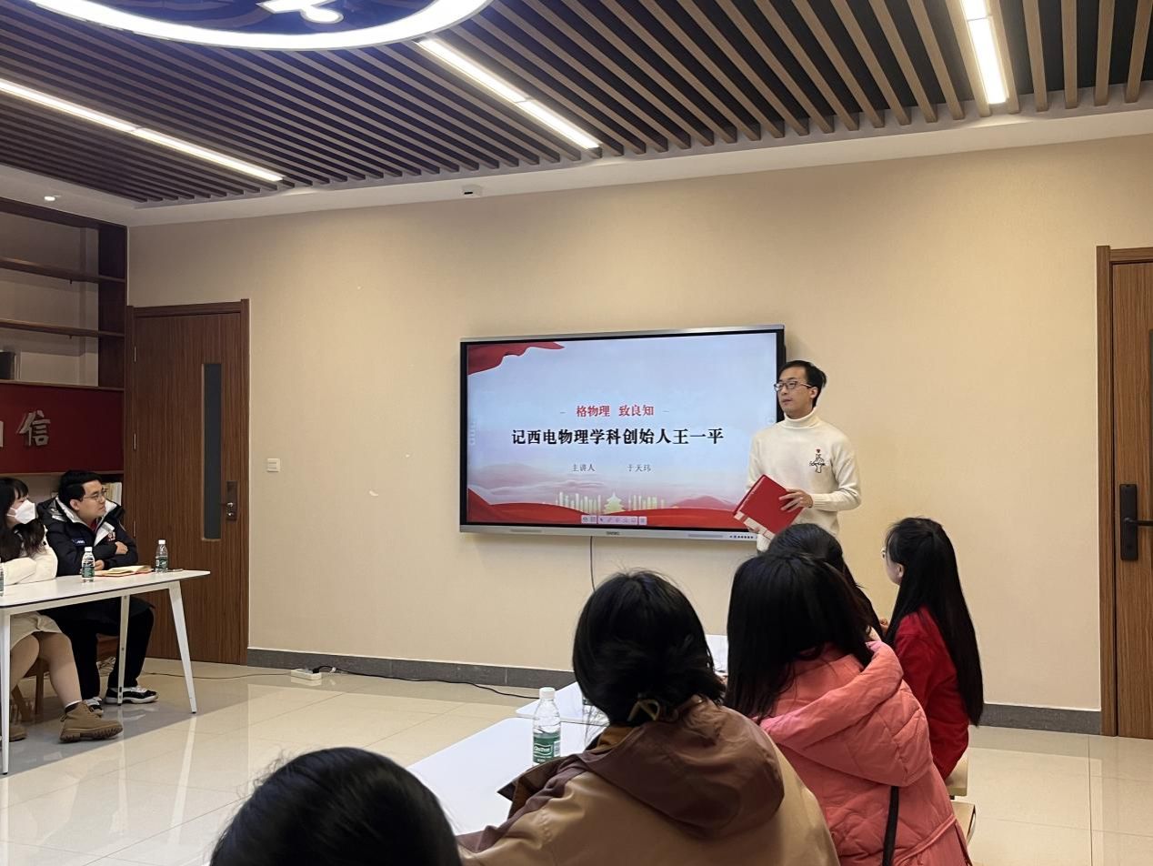 太阳成集团tyc33455cc硕士2023级党支部书记于天玮作了《格物理致良知——记西电物理学科创始人王一平》主题宣讲,讲述了西电物理学科创始人王一平的传奇故事,包括武汉大学地下党的革命经历、创办物理学科、物理团队班人才培养等,回顾了王一平教授一生的奋斗历程和革命、教育贡献,勉励同学们传承红色血脉,赓续科学家精神,为新时代物理学科和基础科学发展作出自己的贡献。
