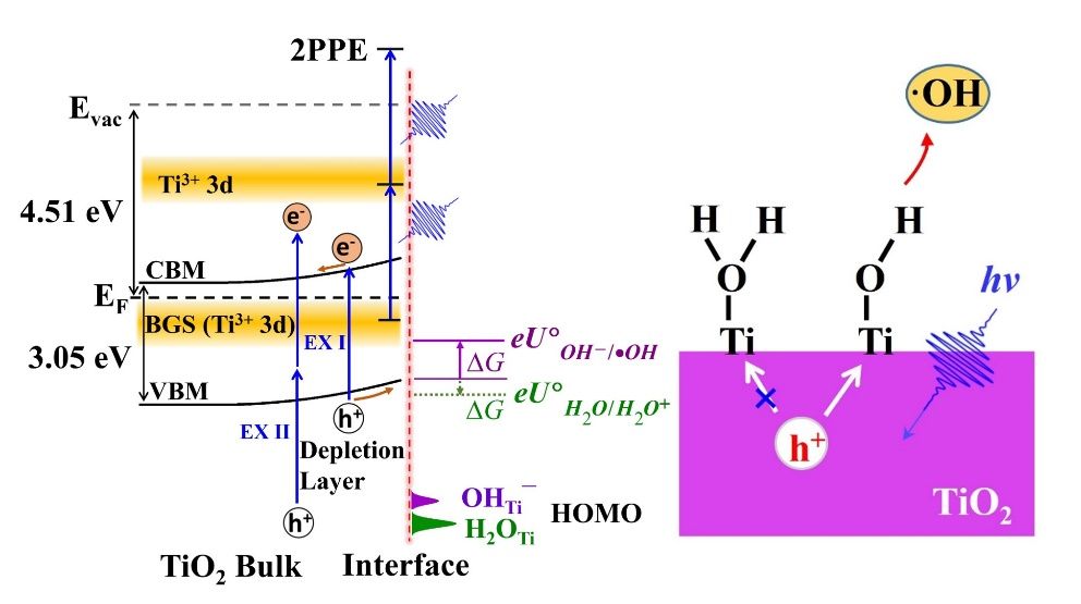 自1972年Fujishima和Honda发现二氧化钛(TiO2)电极在紫外光照射下分解水的现象以来,TiO2因其高稳定性、低成本、无毒和相对较高的活性成为研究光催化基本过程的模型催化剂。其中TiO2光催化水氧化初始步骤的活性位点和活性物质仍存在争议。本工作采用独特的超高真空的表面科学技术,结合时间依赖的双光子光电子能谱、X射线光电子能谱(XPS)和程序升温脱附谱(TPD)在分子水平上研究了TiO2(110)光催化水氧化的初始步骤。本工作明确了Ti5c和OHt¯为TiO2(110)表面光催化水氧化初始步骤中的活性位点和活性物质,为后续研究TiO2析氧反应机理奠定了坚实基础,也进一步说明表面科学在反应机理研究中的重要作用。该研究工作得到了国家重点研发计划、国家自然科学基金、陕西省自然科学基金等项目的支持。