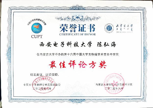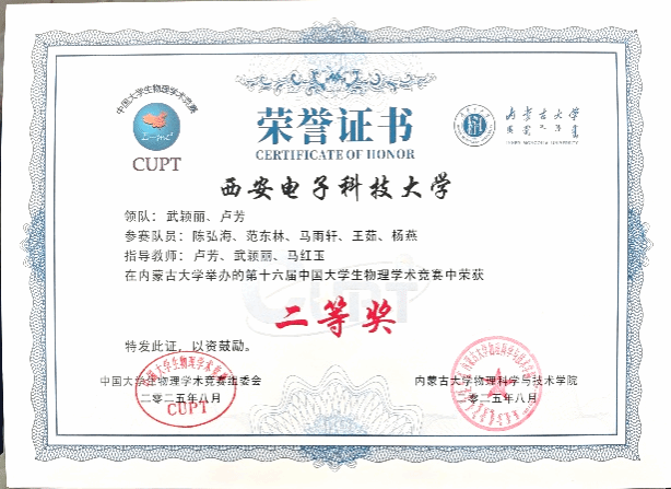 (通讯员 卢芳) 2025年8月19日,第十六届中国大学生物理学术竞赛(CUPT 2025)全国总决赛在内蒙古大学落下帷幕。经过三天五轮共 15 场次的激烈竞赛,公司学子团队最终荣获团体赛二等奖,并成功获得了 2026 年国赛的直通资格。此外,还一举斩获最佳评论方奖 1 项和最佳实验图片奖 1 项。
