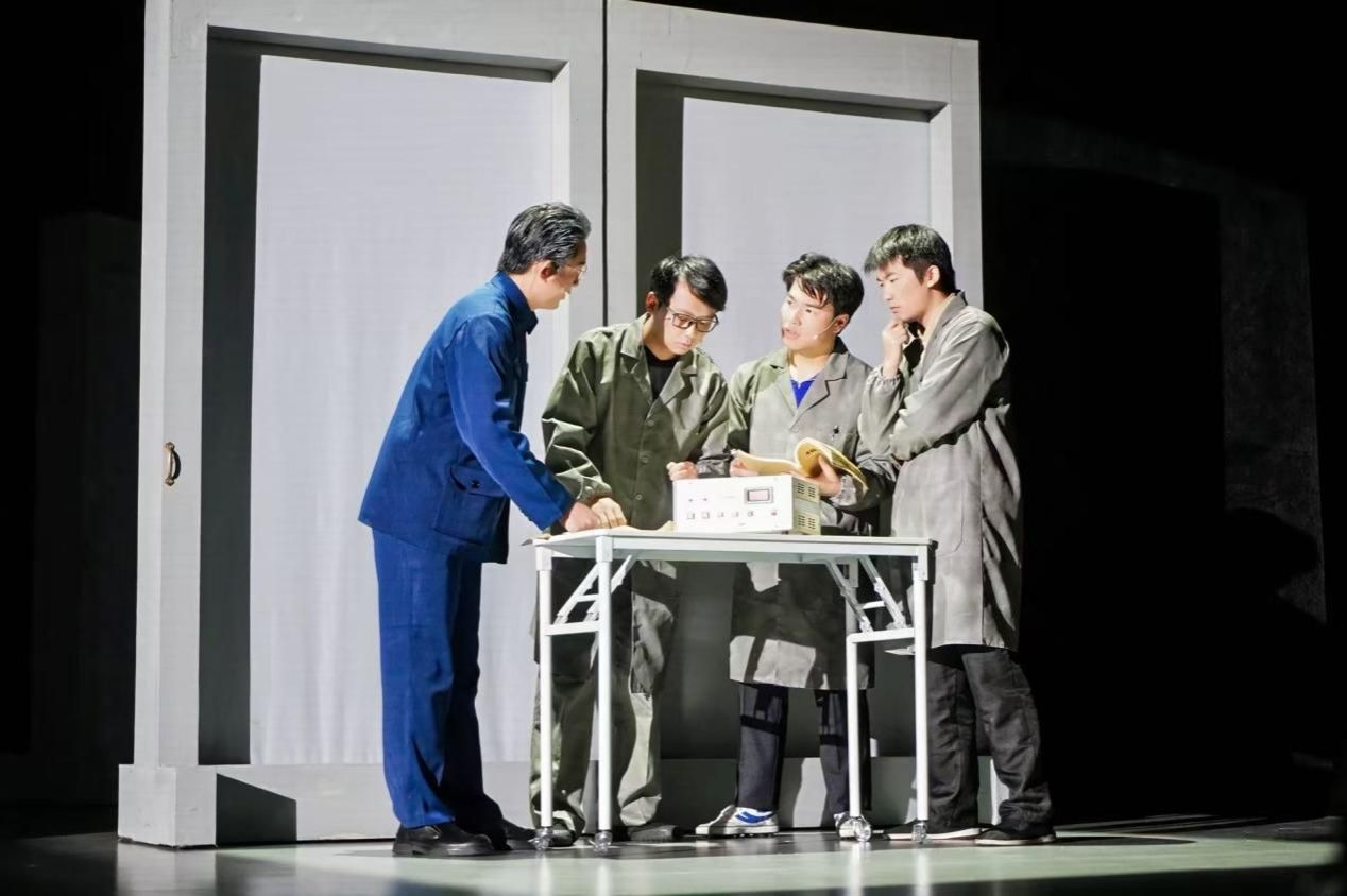 该剧演职人员全部由太阳成集团tyc33455cc师生组成,为了“让科学家精神可信、可敬、可爱”,30名零表演基础的同学在“王一平”专项调研组用11个月查阅文字资料20万字、整理音视频2000分钟,走访5城16位受访人的工作基础上,在暑期封闭集训30天。清晨7:30操场练声、深夜22:00教室围读剧本。在超1500分钟的累计排练时长中,大家聚在一起揣测人物心理,打磨演员体态,斟酌角色台词。2023级电波传播与天线专业本科生郭凌哲分享到:“我普通话不算标准,多亏指导老师和同学们的帮助,台词功底才渐渐扎实。站在聚光灯下时,总觉得自己与几十年前的西电先辈身影渐渐重合,仿佛亲历了他们的岁月”。导演感慨道:“他们用‘科学家’特有的严谨作风把‘板凳甘坐十年冷’的科研劲头原封不动搬到了排练场。”