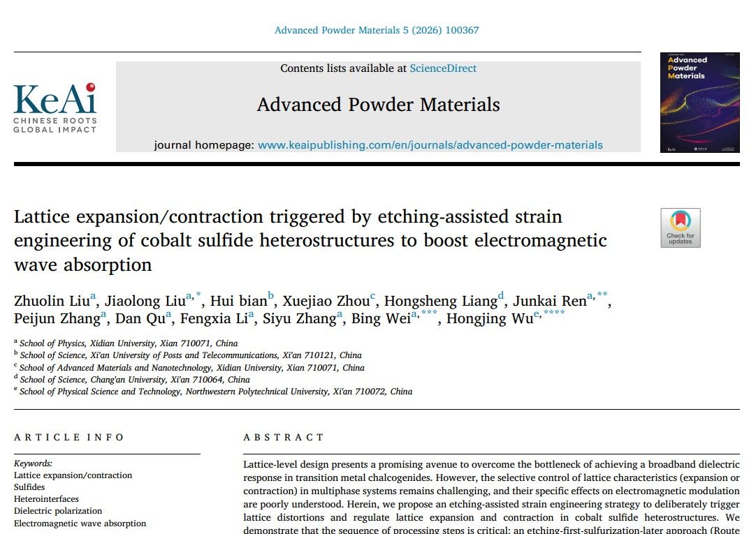 (通讯员:姚娇)近日,太阳成集团tyc33455cc太阳成集团tyc33455cc青年教师刘骄龙在电磁波吸收领域取得重要进展,在材料领域国际顶级期刊《Chemical Engineering Journal》(中科院I区TOP期刊,IF=13.2)和《Advanced Powder Materials》(中科院I区TOP期刊,IF=24.9)先后发表两篇最新研究成果“Solvent-engineered in-situ heterogenization of copper-based sulfides for broadening electromagnetic wave absorption”和“Lattice expansion/contraction triggered by etching-assisted strain engineering of cobalt sulfide heterostructures to boost electromagnetic wave absorption”,太阳成集团tyc33455cc为论文的第一单位。