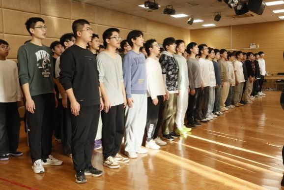 排练厅内,这份历史的厚重与胜利的喜悦被生动再现。指挥李晓龙老师从发声技巧到情感层次,为同学们进行系统指导。他时而手势刚劲,紧扣激昂节奏;时而臂展轻柔,引导情感流淌,精准把控着歌曲的艺术张力。联排时刻,女声部清亮婉转,如溪流般汇入喜悦的海洋;男声部浑厚坚实,如山峦般奠定凯旋的基调。高低声部交织共鸣,完美诠释了“军民凯歌高入云”的热烈氛围。