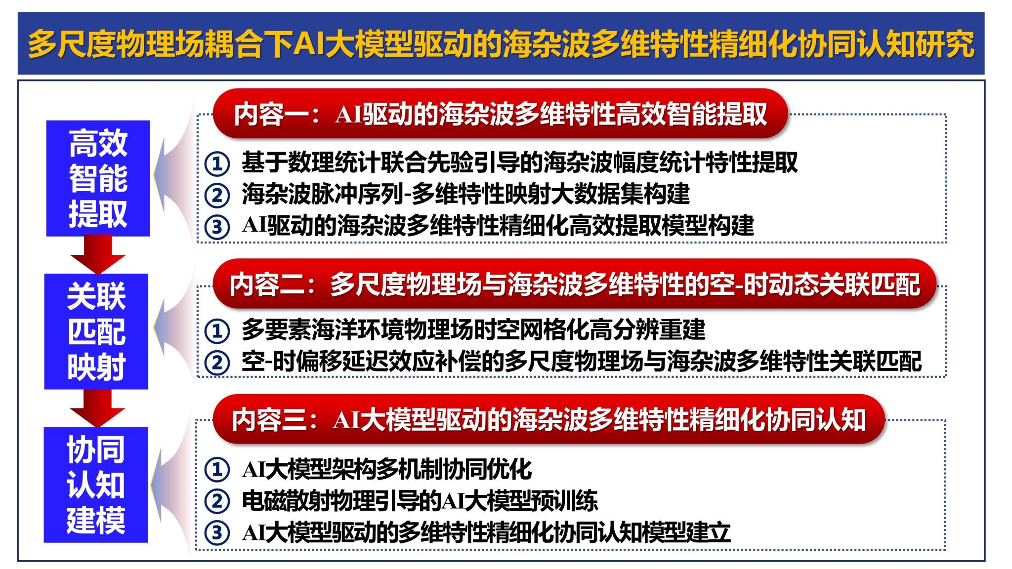 为提升我国雷达在复杂海洋场景下的探测识别能力,该项目依托现有多平台实测海杂波大数据资源,基于AI架构研发海杂波原始数据的多维特性智能解析方法,实现多维特性精细化高效提取;开展多尺度物理场与海杂波多维特性的空-时动态关联匹配研究,构建多尺度场景参数与多维特性关联匹配映射,建立融合多尺度物理场与多维特性的高维映射大数据集;最终通过AI大模型的强大计算能力与复杂非线性推理能力,实现多尺度物理场协同耦合约束下的海杂波多维特性高阶非线性映射建模突破,达成对海杂波特性的精细化深度认知目标。该项目致力于系统性提升我国对海杂波物理特性的科学认知水平,为国产雷达装备的对海目标精准探测与智能识别提供核心技术支撑,为其在复杂海洋环境探测效能跃升构筑坚实技术保障,对强化海防预警体系和应对非对称威胁具有重大战略价值。