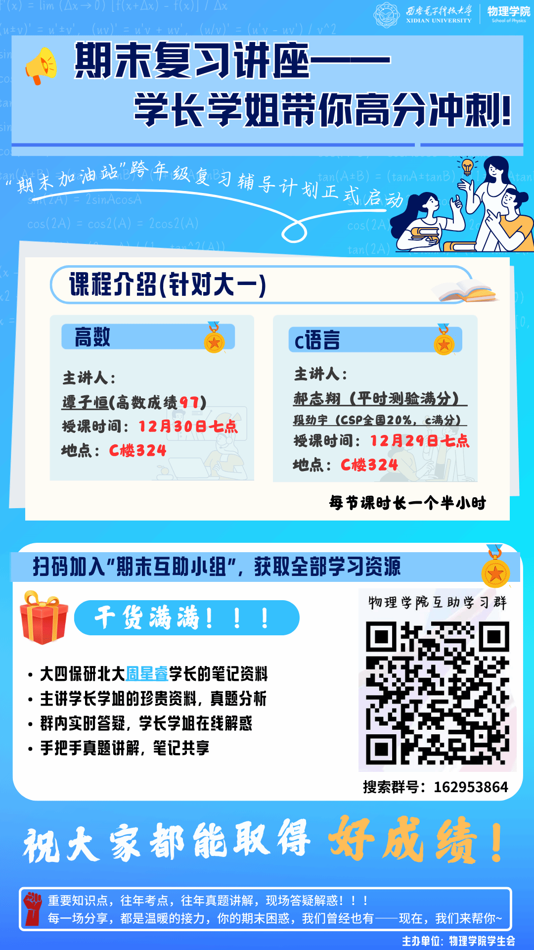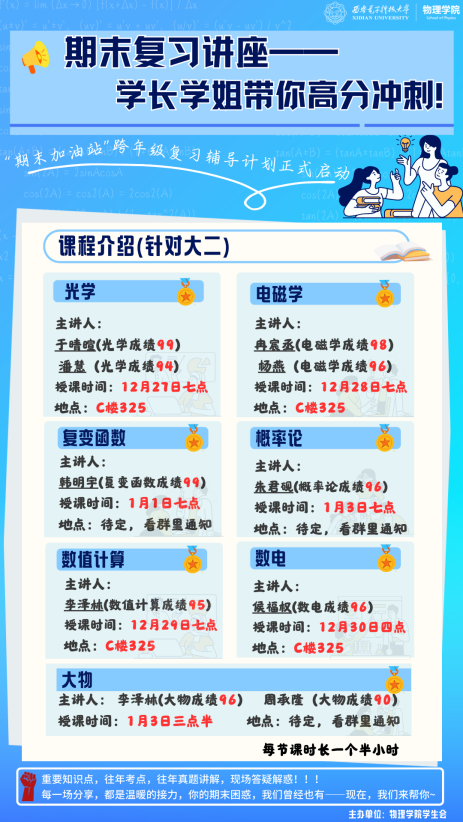 活动前期,员工会精心策划、严格遴选,旨在搭建跨年级、跨学科的学业互助平台,切实回应同学们在期末复习中的共性需求。来自不同专业的优秀高年级员工结合学科特点,系统梳理了9门课程的知识框架,并对典型题型进行了细致讲解。主讲人将自身学习经验倾囊相授,深入解析重难点,同时分享了时间规划、笔记整理、应试技巧等实用策略,为学弟学妹们提供了清晰可行的复习“路线图”。