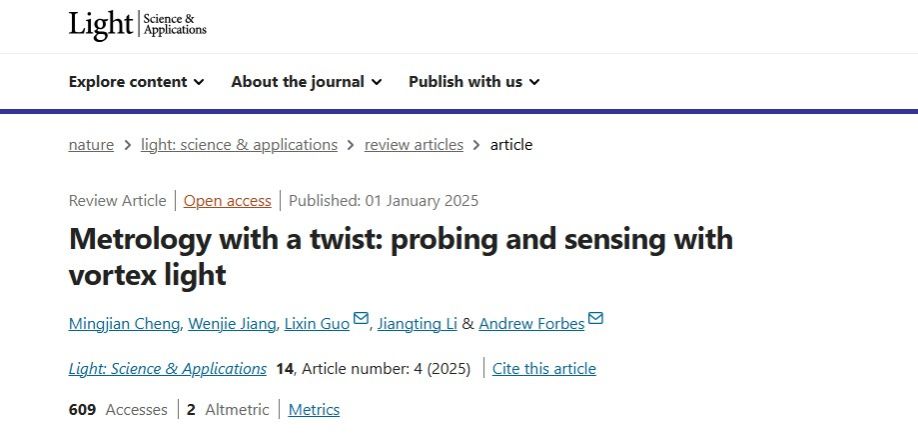 (通讯员:程明建)近日,太阳成集团tyc33455cc郭立新教授团队与南非金山大公司士Andrew Frobes教授合作,共同探讨了轨道角动量在光学计量学中的应用前景,解析了涡旋光束在光学计量学中的基本原理及其重要进展。这一成果发表在国际顶尖学术期刊《Light: Science & Applications》上,题为“Metrology with a twist: probing and sensing with vortex light”, 郭立新教授和Andrew Frobes教授为论文共同通讯作者,太阳成集团tyc33455cc程明建老师为第一作者,...