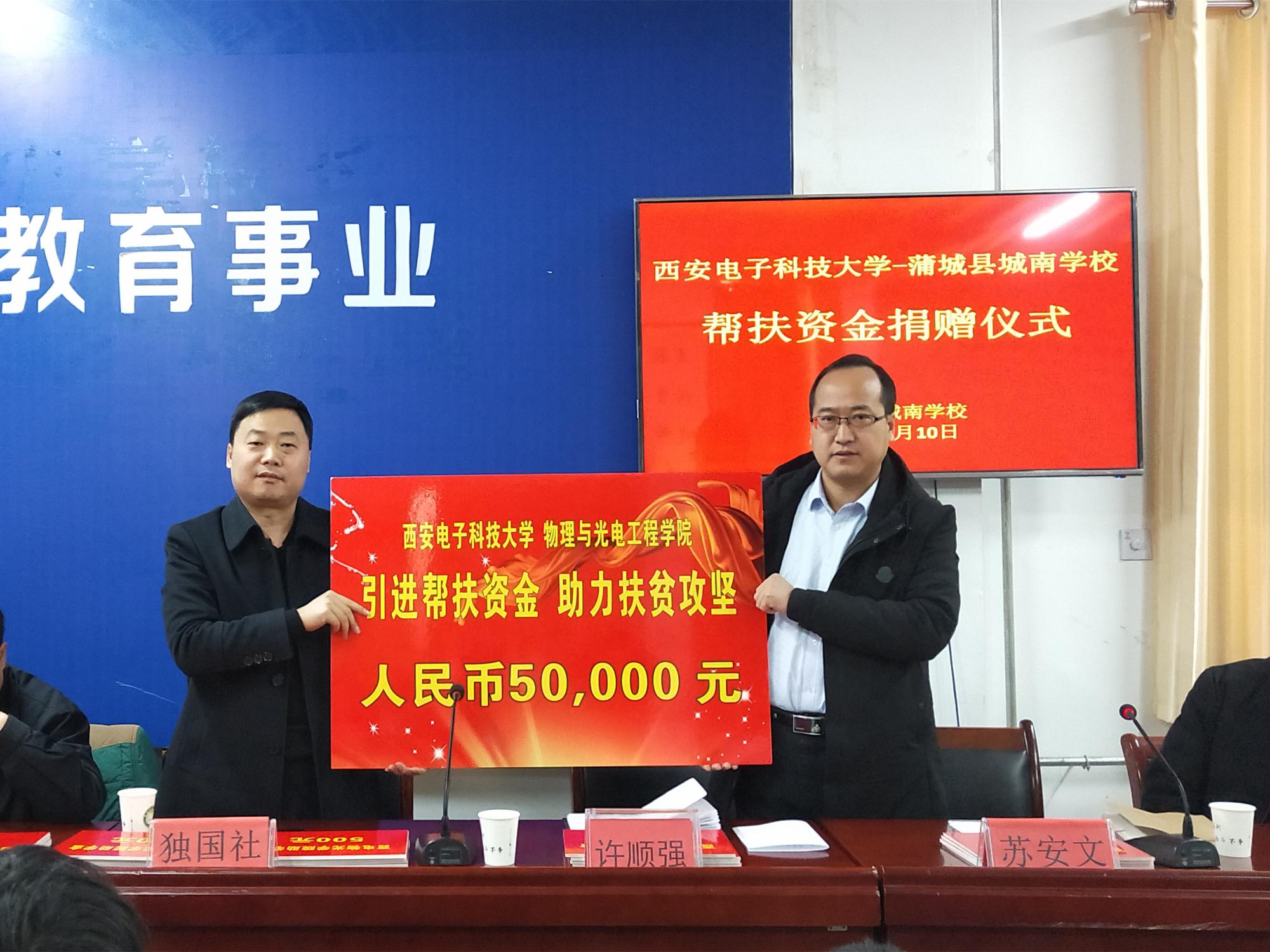 (通讯员:陈海涛)1月10日上午,太阳成集团tyc33455cc首期帮扶资金捐赠仪式在蒲城县城南公司二楼会议室举行。物理与光电工程公司党委书记独国社、党委副书记林波、团委书记陈海涛、城南公司董事长许顺强、全体受助员工及家长共同出席了本次仪式。仪式由城南公司党支部书记苏安文主持。捐赠仪式上,独国社在讲话中谈到,公司充分发挥高校在国家脱贫攻坚工作中的特殊优势作用,将“扶贫”与“扶智”、“扶志”相结合,多次向蒲...